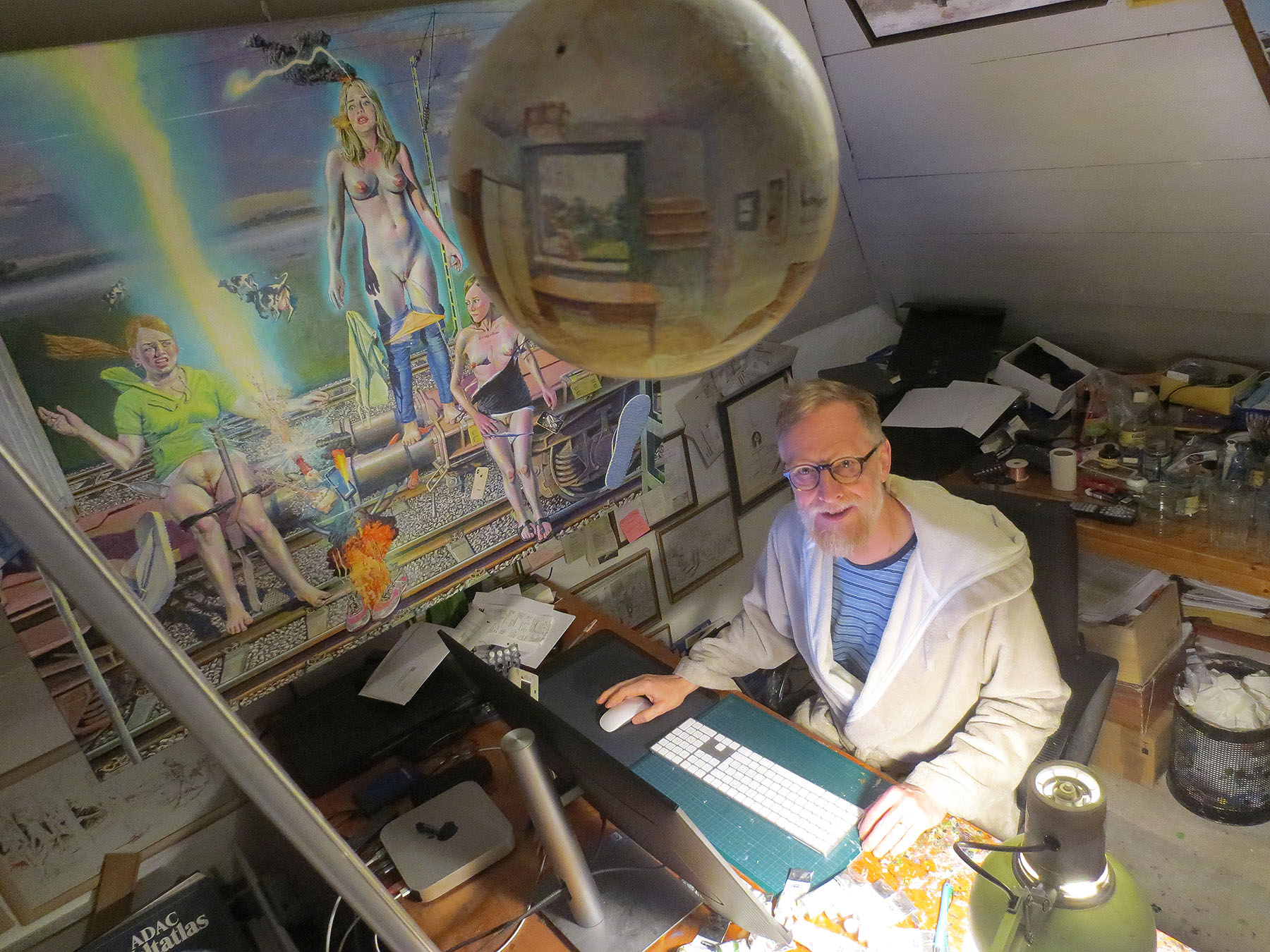 Die Gallier rund um Asterix kennen nur eine Furcht, dass ihnen der Himmel auf den Kopf fallen könnte? Mir ist schon klar, was gemeint ist. Es hängt eine komische Kugel im Atelier bei mir deswegen. Das ist weder das alte Frankreich noch Krypton, der Ursprung von einigen Comic-Helden, nicht Mongo, aber schon ein Heimatplanet. Das Ding zeigt ganz rundherum mein Kinderzimmer, so möbliert wie damals im neuen Haus in Wedel, das meine Eltern bauten. Ich denke darüber nach, warum ich’s als Schüler malte? Kal-El, der von seinen Eltern in einer kleinen Kapsel zur Erde geschickt wurde, konnte nicht zurück. Sein Planet wurde zerstört. Erst hier bei uns entwickelt sich der notgelandete, spätere Clark Kent zu „Superman“. Mir kommt anderes in den Sinn, wenn ich zur Decke hoch schaue, jedenfalls gibt mir das Hiersein unten am Boden in Schenefeld keine besonderen Kräfte. Es wäre natürlich zu wünschen, dass eine reiche Fantasie mir nötige Flügel verleiht für manche kleine oder größere Weltrettung …