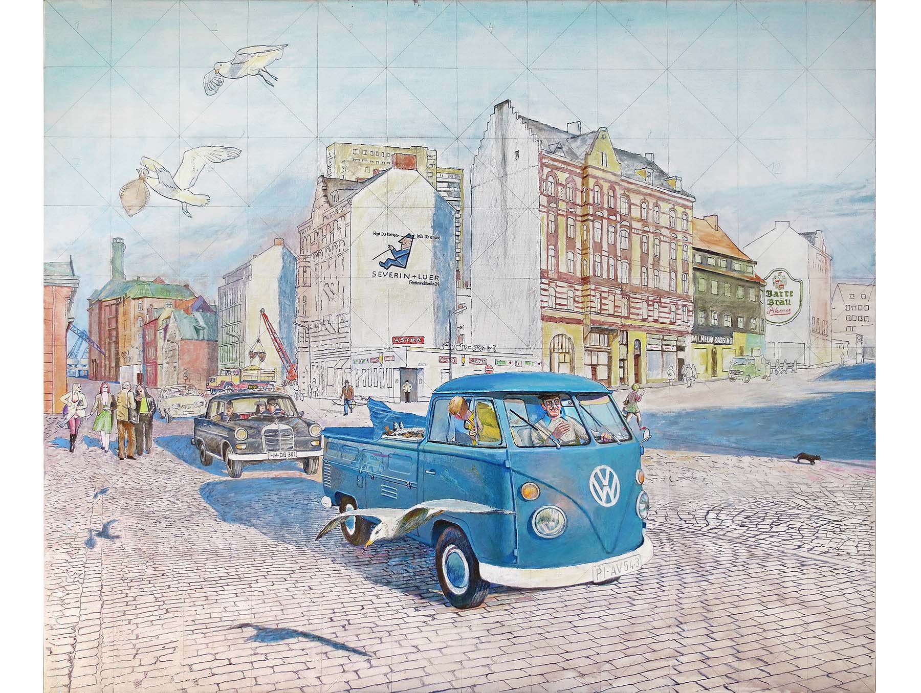 Ich nutze diese Texte, um zu beschreiben, was in ein Bild einfließen kann an Überlegungen. Das noch nicht fertige Gemälde „Zeitmaschine“ zeigt meinen Vater mit mir im ersten Transporter, den wir kauften. Ich arbeite schon lange daran. So kann ich noch erzählen, die Wochenenden verbrachten wir beim Segeln, und ich bin dabei geblieben. Mein Vater war Elbsegler, hat sich ein wenig in die Ostsee vorgetraut oder in die Watten bei uns vor der Tür. Die Karibik? Onkel Hans-Jürgen, es ist nur ein Nennonkel, muss man sagen, wollte mehr. Er hat auch beruflich mehr aus seinem Leben gemacht (und seines dauert noch an, während „Bassi“, mein Vater, schon seit einigen Jahren tot ist). Hans-Jürgen dürfte also mindestens fünf Jahre älter sein als mein Vater, geht auf die Hundert zu. Er lebt, und wie ich gelegentlich mitbekomme, geht es ihm gut fürs hohe Alter. Er sei streitbar wie früher, auch was die Politik betrifft, heißt es.